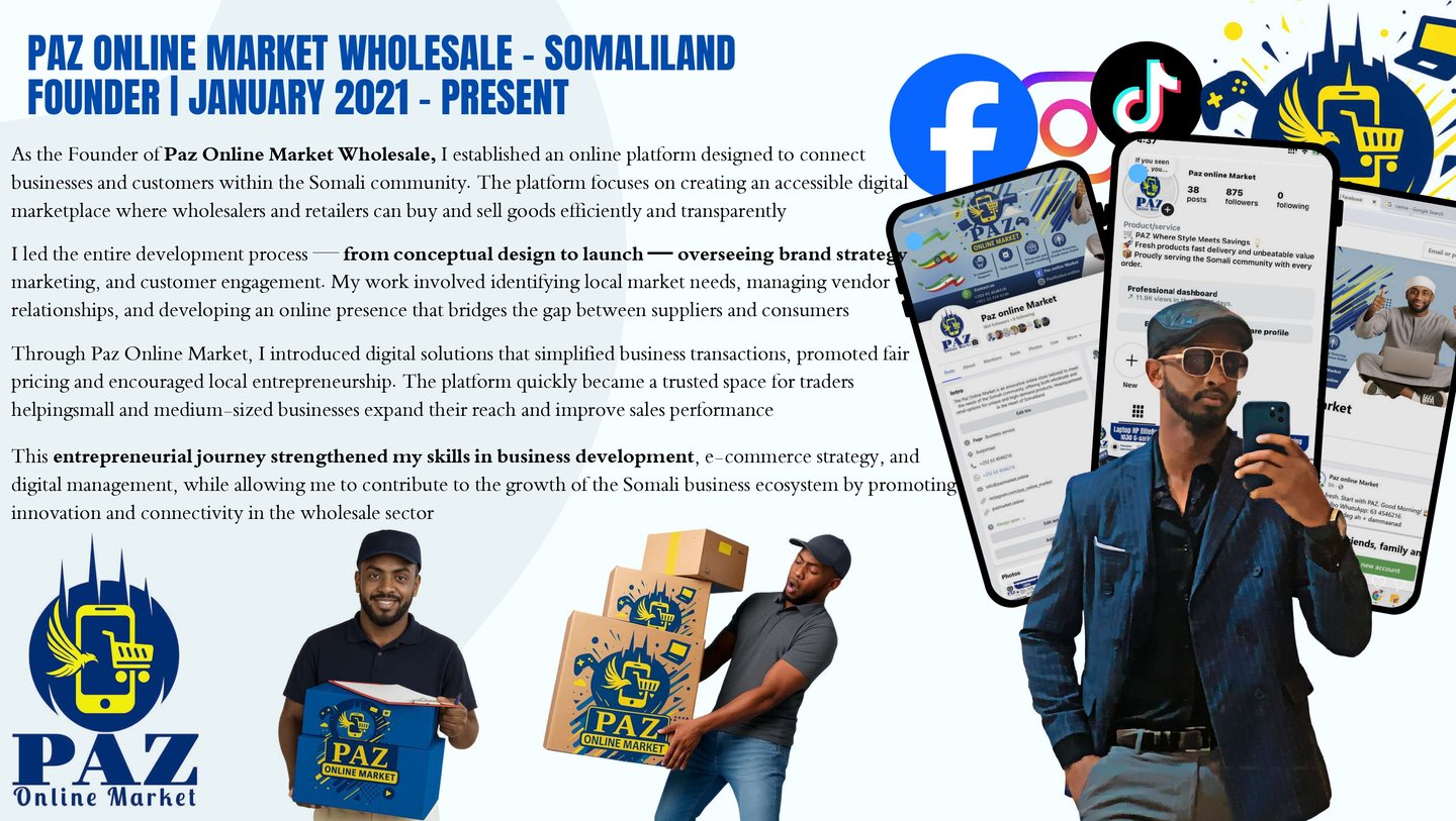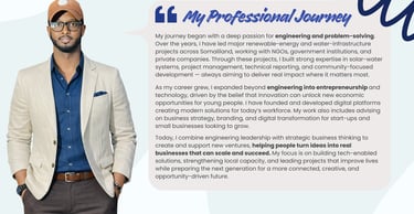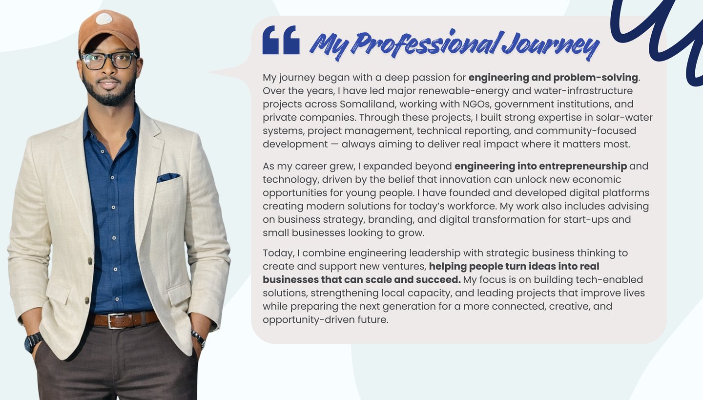 Today, my work combines engineering, leadership, innovation, and entrepreneurship. I manage solar and water projects across Somaliland, run Paz Online Market as an emerging business platform, and create educational content to inspire young people. Everything I do is driven by one mission: to create sustainable solutions that improve lives and push our community forward.