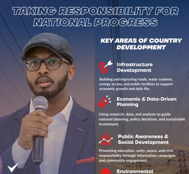 We focus on infrastructure development, enhancing roads, water systems, energy access, and public facilities to support daily life and economic growth. Economic and data-driven planning allows us to guide policies, national planning, and sustainable investments. Public awareness and social development initiatives promote education, unity, peace, and civic responsibility through community engagement.