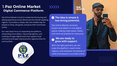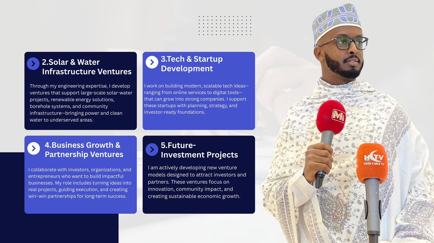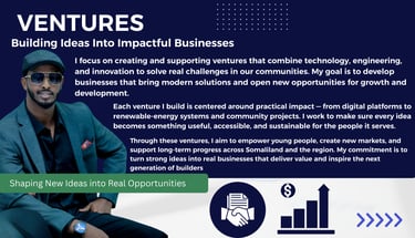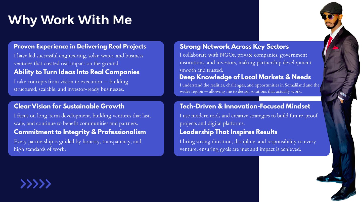 I build and support businesses that create long-term impact in Somaliland and the region. My ventures focus on technology, engineering, and community-centered solutions that open new opportunities for young people, investors, and partners.